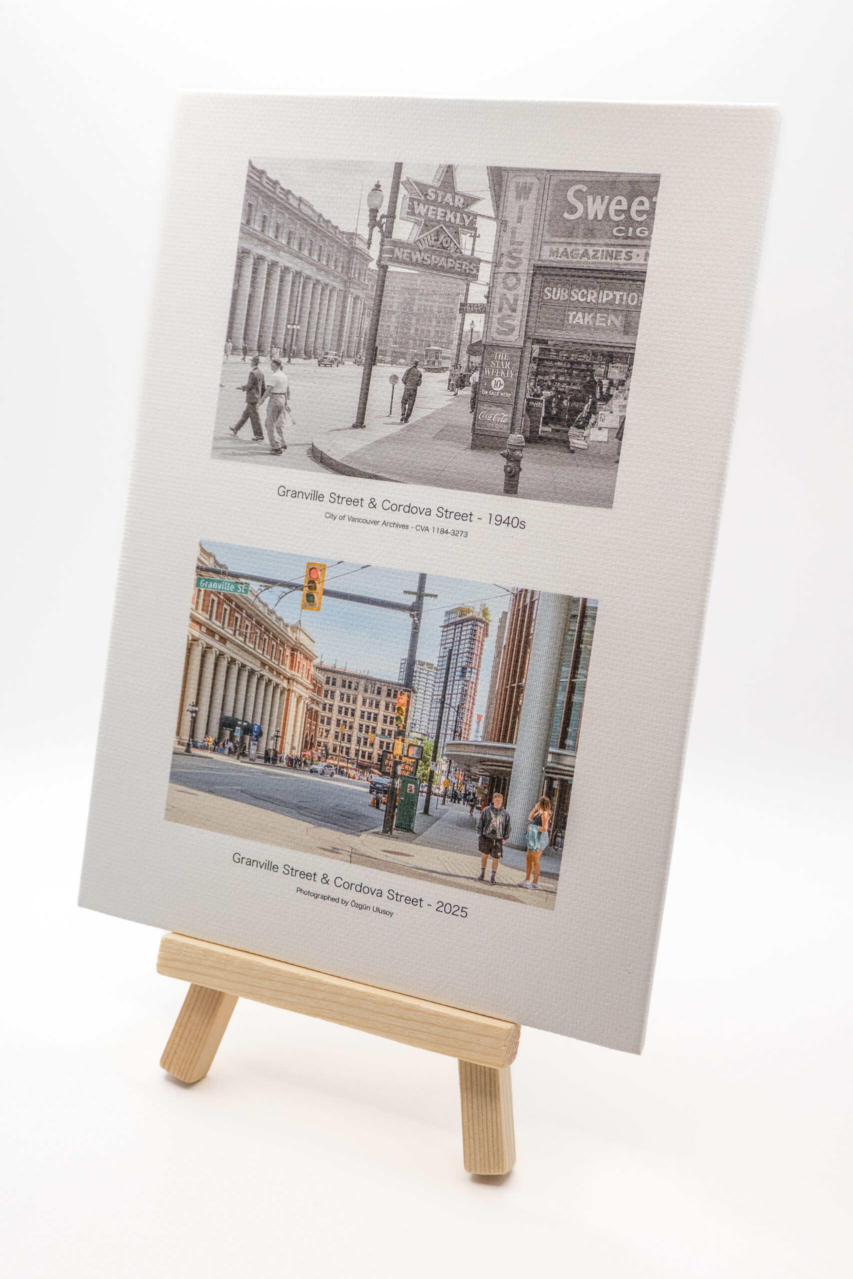 Each canvas print is carefully mounted on a thick 5″x7″ board and paired with a wooden stand for an easy, stylish display.